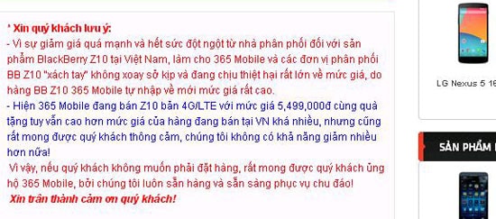 Thậm chí, tại trang web của cửa hàng Mobile 365 (Hà Nội) còn cho đăng “tâm thư” với nội dung: “Xin quý khách lưu ý: Vì sự giảm giá quá mạnh và hết sức đột ngột từ nhà phân phối đối với sản phẩm BlackBerry Z10 tại Việt Nam, làm cho 365 Mobile và các đơn vị phân phối BB Z10 "xách tay" không xoay sở kịp và đang chịu thiệt hại rất lớn về mức giá, do hàng BB Z10 365 Mobile tự nhập về mới mức giá rất cao.