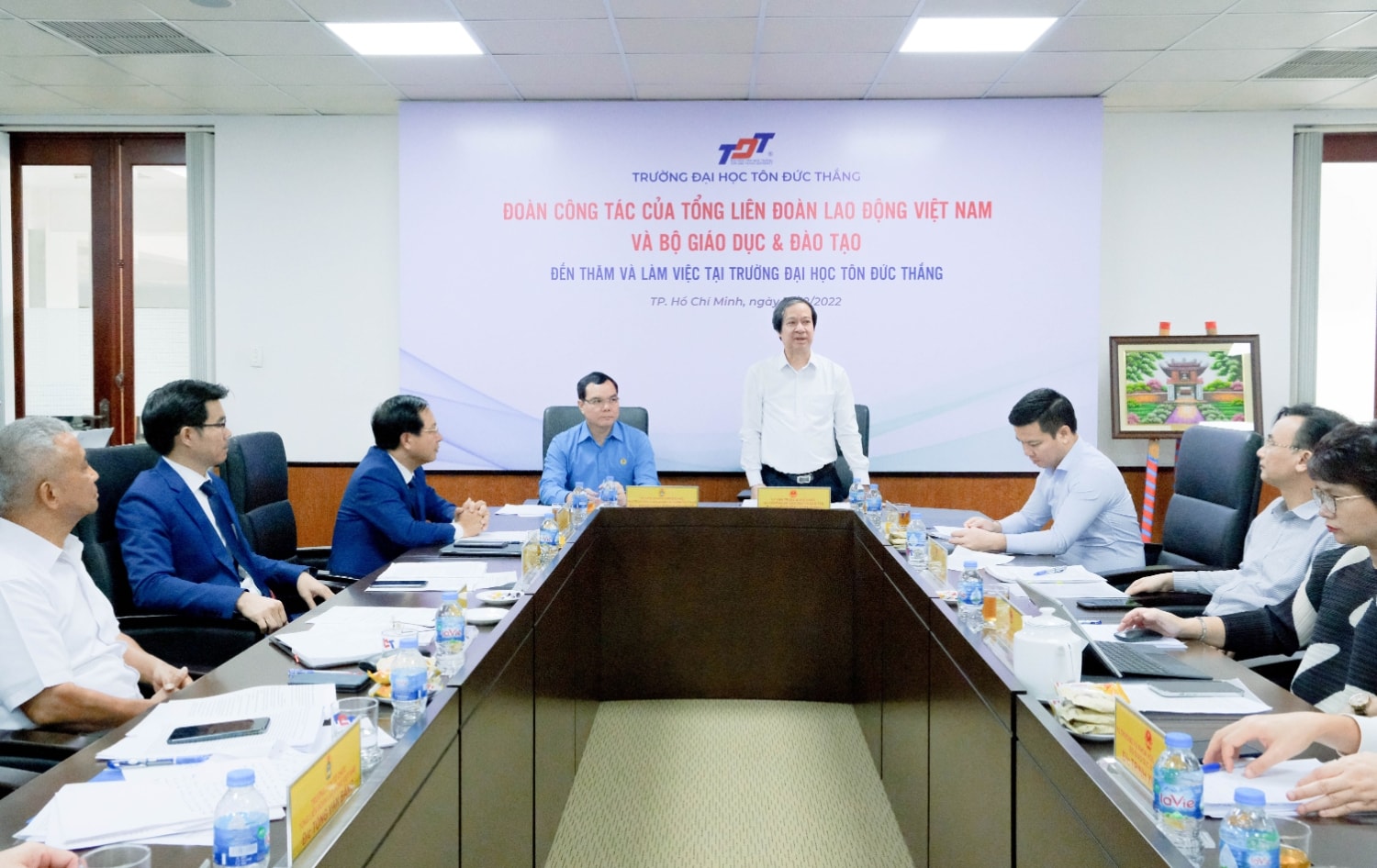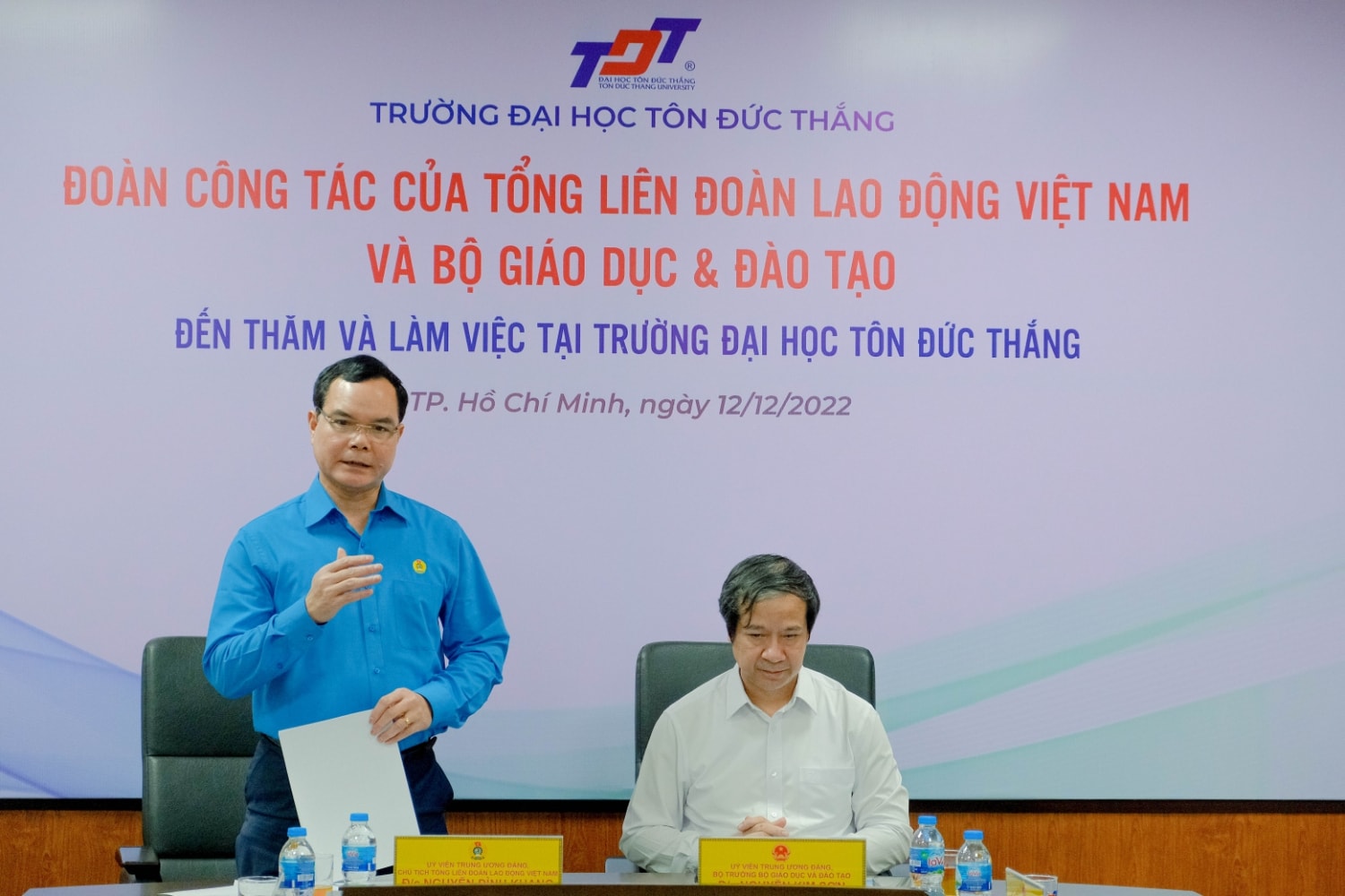 Ngày 12/12, đoàn công tác củaBộ Giáo dục và Đào tạo (GD&ĐT) và Tổng Liên đoàn Lao động Việt Nam (TLĐLĐVN) do Bộ trưởng Bộ GD&ĐT Nguyễn Kim Sơn và Chủ tịch TLĐLĐVN Nguyễn Đình Khang dẫn đầu đã đến thăm và làm việc tại Trường Đại học Tôn Đức Thắng (TDTU).