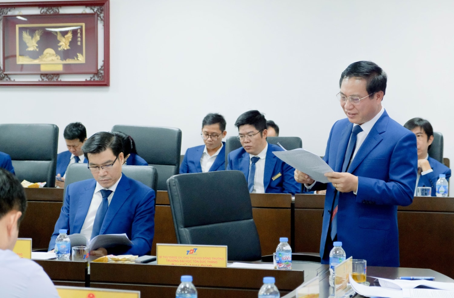 TS. Vũ Anh Đức - Chủ tịch Hội đồng trường TDTU báo cáo với đoàn công tác về các hoạt động của nhà trường.