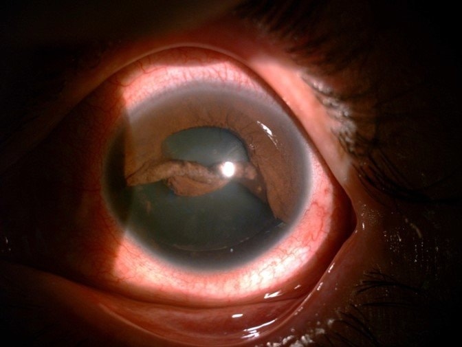 Mống mắt bị đứt và cuộn lại sau khi bệnh nhân bị vòi xít nước bắn vào mắt.